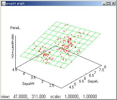 //regression 3D reg PetalL by SepalL SepalW; //read output of regression 3D. get freq@ana; //view plot of regression of 3D. plot reg;
