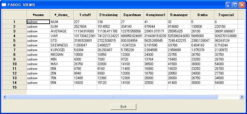 // //anaput command // //this command is used to put the result table to file. //syntax anaget filename //Examble hand jobcat jobname/ 1 1:stuff 2 2:trainning 3 3:gardman 4 4:engineerl 5 5:maneger 6 6:mba 7 7:special ; put jobname_; get bank.csv@; merge jobname_ by jobcat; statis salnow by jobname; //put the result table to file. anaput jobsalnow; get jobsalnow; //view result