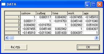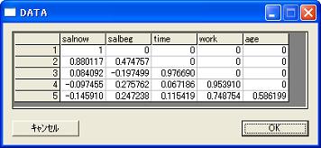 //Save average and std. to tempolary file. get freq@ana; put f_stat; // //Generate normal distibution which has same average and std,covariance of school.csv. // //Declare data clear and vector to use as below. clear; vector x[3]; vector ch[3][3]; vector sum[3]; //Generate 500 records which is normal distribution by loop. for(i=1;i<=500;i++) { //Get average and std from file by outlook function. x1m=outlook(f_stat,"_items_","AVERAGE","x1"); x1v=outlook(f_stat,"_items_","STD","x1"); x2m=outlook(f_stat,"_items_","AVERAGE","x2"); x2v=outlook(f_stat,"_items_","STD","x2"); ym=outlook(f_stat,"_items_","AVERAGE","y"); yv=outlook(f_stat,"_items_","STD","y"); //Generate 3 normal distoribution. x[1]=ranstd(x1m,x1v); x[2]=ranstd(x2m,x2v); x[3]=ranstd(ym,yv); //Make cholesky matrix from file by outlook function. ch[1][1]=outlook(f_chole,"#",1,"x1"); ch[1][2]=outlook(f_chole,"#",1,"x2"); ch[1][3]=outlook(f_chole,"#",1,"y"); ch[2][1]=outlook(f_chole,"#",2,"x1"); ch[2][2]=outlook(f_chole,"#",2,"x2"); ch[2][3]=outlook(f_chole,"#",2,"y"); ch[3][1]=outlook(f_chole,"#",3,"x1"); ch[3][2]=outlook(f_chole,"#",3,"x2"); ch[3][3]=outlook(f_chole,"#",3,"y"); //Set covariance to normal distribution. for(j=1;j<=3;j++) { sum[j]=0; for(k=1;k<=3;k++) { sum[j]=sum[j]+ch[j][k]*x[k]; } } x1r=sum[1]; x2r=sum[2]; yr =sum[3]; //Output earch reacord. outrec; }