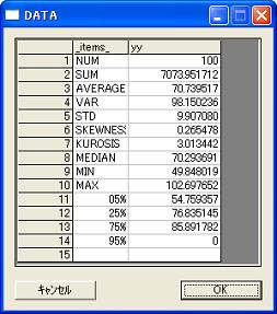 //Save statistic propertis to tempolay file to use by outlook function. get freq@ana; put f_stat; //Clear current file which is statistic property data. clear; //Generate 100 record by for_loop and outrec. for(i=1;i<=100;i++) { //Get average and std from file by outlook function. x1m=outlook(f_stat,"_items_","AVERAGE","y"); x1v=outlook(f_stat,"_items_","STD","y"); //Generate normal distribution by average and std yy = ranstd(x1m,x1v); //Generete record. outrec; }