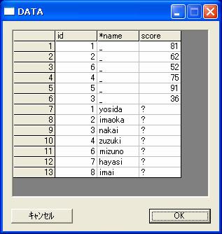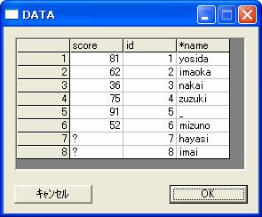 // //concat command // //This command is used to concatinate records appointed file to current file. // //Syntax. concat [filename]@[prjname]; //Argument is filename to concatinate to current file. //Example 1 hand id name/ 1 yosida 2 imaoka 3 nakai 4 zuzuki 6 mizuno 7 hayasi 8 imai ; put class_names; hand score id/ 81 1 62 2 52 6 75 4 91 5 36 3 ; //Execute concatinate records of appointed file 'class_name' to current file. //If both file have common variable name. this variable is concatinated. //But no common variable name are generated as lacked value. concat class_names;