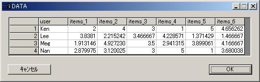 // //Collaborative Filtering analysis command //Cmmand name is grouplens which infer unkown score by correlation. // //Quation //This command needs data which is consited of 3 colomns as user item score. // //Syntax grouplens score by user item; // //Options // method=sum //score is used by sum of score; method=ave //(defalut) score is used by score average. method=no //score is used count. method=bool //score is used exist or no exist. // //Example // //Read score reference table which is consist of user and item. //But this table includes unkown score (?). //This command infers unkown score by collaborative filter. // get grpout.csv@