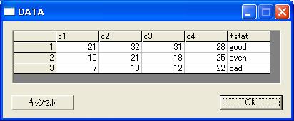 // //handin data command // //This command is used to define data directly. //(Quation) //If code data which is represented by integer,you must set '*' to front of valiable name. //example id -> *id //Syntax hand [variables]/ [datas] ; //Example 1 χ二乗検定 //hand in data about cross table which is count by 4 category and 3stat. hand c1 - 4 stat/ 21 32 31 28 good 10 21 18 25 even 7 13 12 22 bad ;