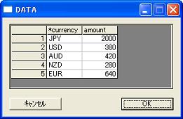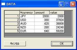 // //outlook function //This founction extracts value of assinged variable name on some condition from file.. // //Syntax This function allows num of variable argument. outlook(filename,varialbe1,value1,,,variableN,valuen,last_variable); filename :extract value from filename. variable1,value1`variableN,valueN : conditions (variable name = value) last_variable :extraced value is at colum of last_variable name //(Quation1) //Line number variable '#' is allowed as variable name //(Quotion2) //If there are Plural values to be extracted on the assigned condition,first one is extracted. // //Example 1 //Reference by outlook // hand currency fxrate/ USD 99.8 AUD 92.4 NZD 86.6 EUR 92.5 JPY 1.0 ; put fxrate; hand currency amount/ JPY 2000 USD 380 AUD 420 ;
