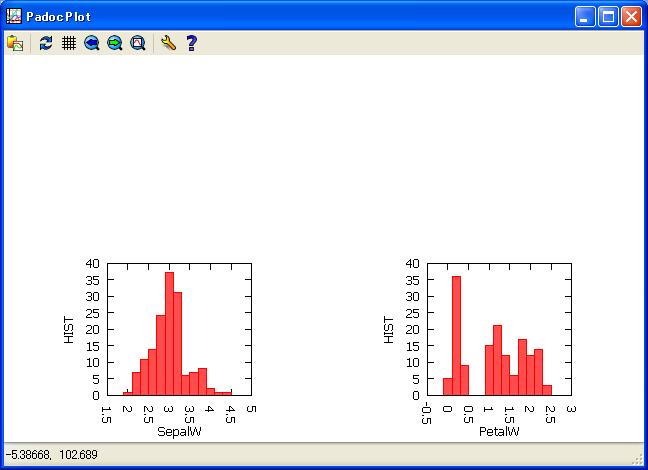 //Example 2-1 two histgram with vertical xtics plot hist SepalW PetalW/ xrotate=90 ;