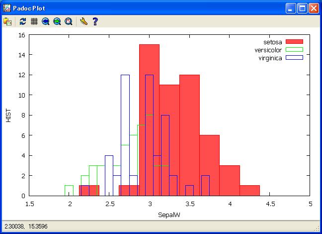 //Example 3 Histgram by category plot hist SepalW by Species;