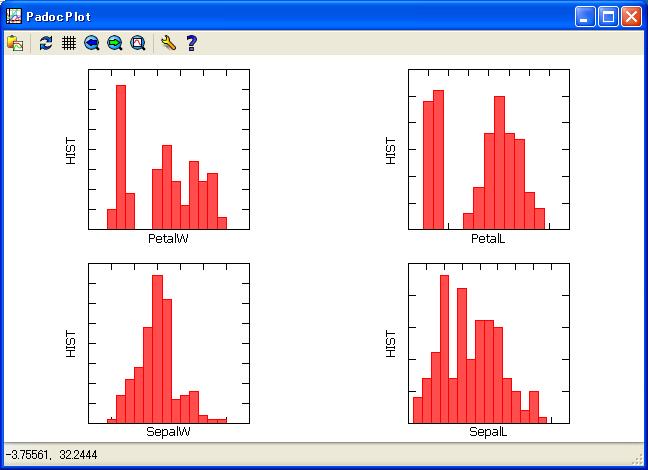 //Example 2-2 Multiple histgram without x tics //If num of variables are 3 or more, histram draws without x tics. plot hist SepalW SepalL PetalW PetalL;