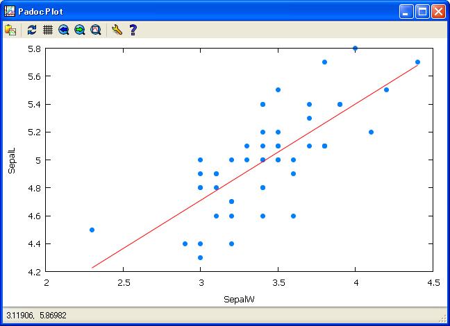 //regression only setosa. if(Species == "setosa") outrec; reg SepalL by SepalW; //get regression coefficent from outputs. get freq@ana; plot reg/ marker=OF color=blue regcolor=red ;