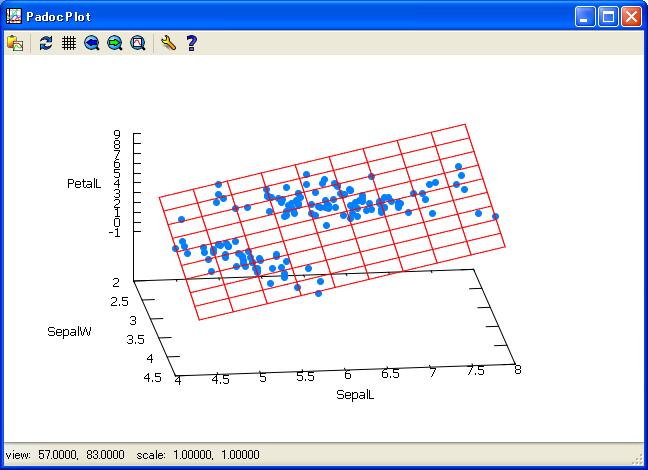 // //Draw regressin line or squrare with data // //this plot command draws regression line or square. //Syntax plot reg; //Option title=title //tilte strings xlabel=x //x axis strings ylabel=y //y axis strings zlabel=z //z axis strings xrange=[xmin:xmax] yrange=[ymin:ymax] zrange=[zmin:zmax] marker:type //example:o,+,x,A,V,box,OF,BF,AF,VF,DF,PF color:color //example:black,red,blue,green,yellow marksize:nn //marker size width:nn //line size regcolor:color //regression line color xrotate=90 //vertical x tics //Cation //Befor this plot command,you have to read outputs of regression. //if 2 dimension regression ex. y=a*x+b,plot reg draws line. //if 3 dimension regression ex. z=a*x+b*y+c,plot reg draws square. //Example is 3 dimension regresion square. get iris@.csv;