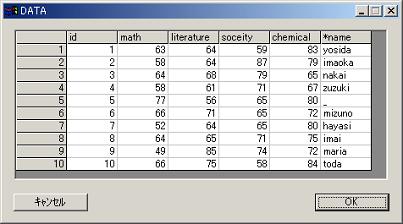 // //Write out command // //This command is used to write out current data to file appointed by file name and project name. // //Projct name // Project name is appointed after letter '@' as syntax. // If project is default directry,you appoint letter '@' only. // Default directory is defined by enviroment variable 'CALC_FDEF'. // If write out to temporaly work file,you need not letter '@' as example. // Temporaly work file is deleted when this tool is end. //File name // This command writes out to file with tab separate whose file extend is tab in default mode. // If write out to CSV file, appoint file extend csv explicitly in file name as example. // But if write out to tab file,you need not appoint extend file type. // //Syntax put [filename]@[prjname] //Example 1 score list with name. //handin name list with class id. hand id name/ 1 yosida 2 imaoka 3 nakai 4 zuzuki 6 mizuno 7 hayasi 8 imai 9 maria 10 toda ; //write out temporaly file. put names; //handin score of subject with class id; hand id math literature soceity chemical/ 1 63 64 59 83 2 58 64 87 79 3 64 68 79 65 4 58 61 71 67 5 77 56 65 80 6 66 71 65 72 7 52 64 65 80 8 64 65 71 75 9 49 85 74 72 10 66 75 58 84 ; //merge temporary file 'names' by class id. merge names by id;push table button to show merge data