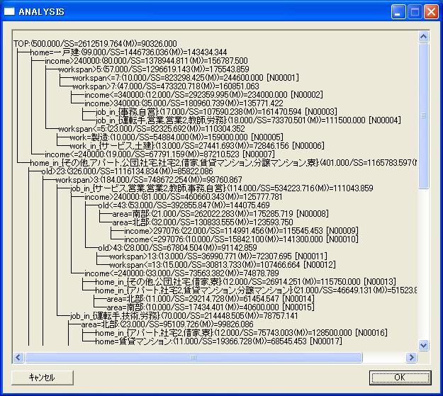 //Execute AIC ranking table according to cross refference the target and explanable variables. cross def by old area dm1 dm2 dm3 dm4 dm5 income work home workspan homespan gender family job amount;//Execute regression tree explanable variables. //This regression target is a continuous variable instead of categorical variable. //This example infers the amount of home value by direct answers and customer profiles. tree amount by income old area work home by explanable variables by tree. workspan homespan gender family job/ target/continuous terminal=20 ; anaput ana1;