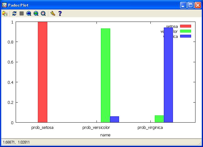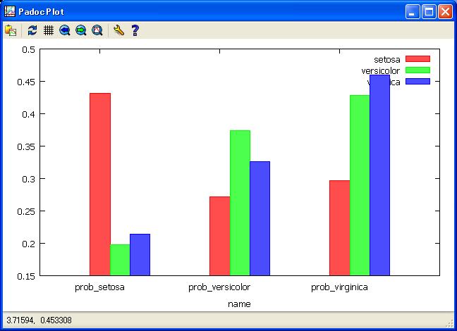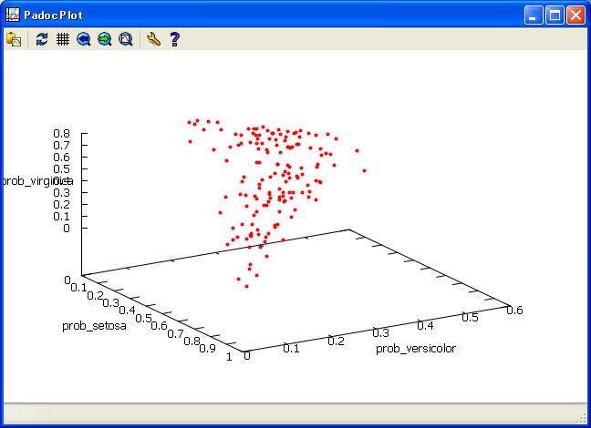 //Execute softmax instruct label of Species by iris data. softmax Species by SepalL SepalW PetalL PetalW/ loop=500 ; //View Probability of target variable. anaput ana1; //Get average probability of each Species get ana1; statis prob_setosa prob_versicolor prob_virginica by Species; anaput ana2; get ana2; if(_items_ == "AVERAGE") outrec; put ana3; //View softmax average probablity by Species with few error classification get ana3; plot bar setosa versicolor virginica by name;//view Weight for each cathcgorys get socre@ana; //Add nomal perturbation to iris data. $set sig 1.0; get iris.csv@; sepall=SepalL*(1+ranstd(0,?sig)); petall=PetalL*(1+ranstd(0,?sig)); sepalw=SepalW*(1+ranstd(0,?sig)); petalw=PetalW*(1+ranstd(0,?sig)); put iris_sig@; //Execute softmax normal perturbation iris data. get iris_sig@; softmax Species by sepall petall sepalw petalw/ eps=0.005 ; anaput ana5; //view of Probability of Species. plot scat prob_setosa prob_versicolor prob_virginica/ marker=OF color=red marksize=0.5 ;