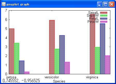 //Plot property of iris by species. get freq@ana; plot bar SepalL SepalW PetalL PetalW by Species;