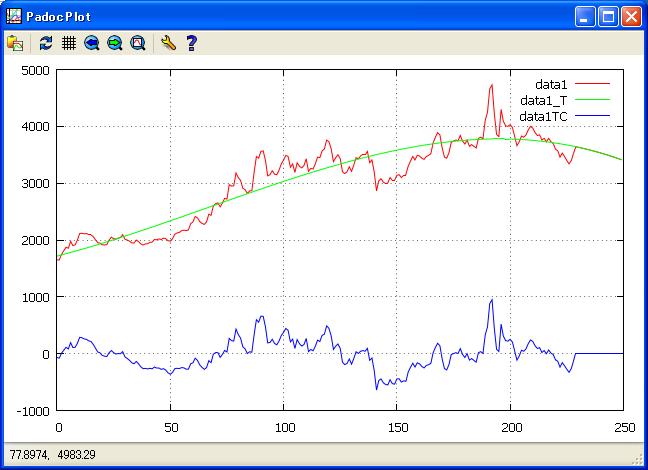 if(# > 229) delrec //This wave has 250 steps,and 229 steps are trainning step. put train; //use tmtrend command for fitting 229 step and predicting 21 step using 4 degree spline. get train; tmtrend data1/ dim=4 period=21 ; anaput traintrend; get traintrend; plot line data1 data1_T dataTC; //data1 is original wave; //data1_T is the spline curve fitting orignal wave; //dataTC is different value meaning data1 - data_T.