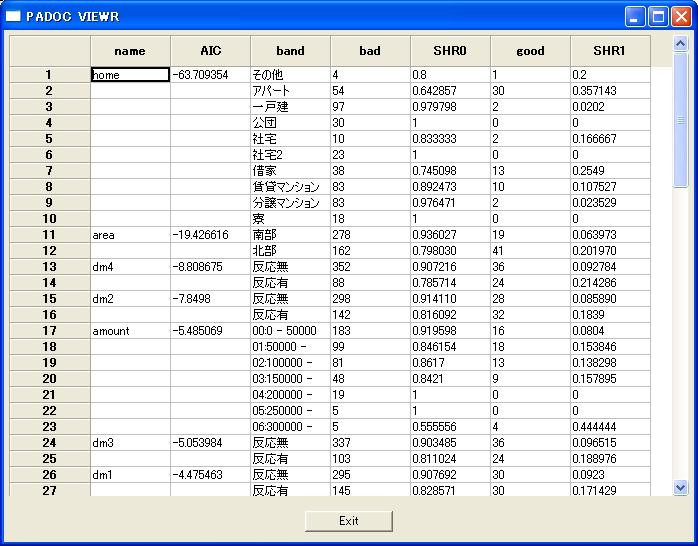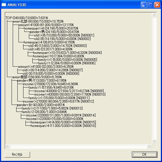 //Execute AIC ranking table according to cross refference the target and explanable variables. cross def by old area dm1 dm2 dm3 dm4 dm5 income work home workspan homespan gender family job amount;//Execute dicsion tree by 50% explanable variables and output 50% test data. get dmdatKNJ.csv@; tree def by old area income work home workspan homespan gender family job amount/ target/good,bad terminal=10 test=50 ; anaput ans1;