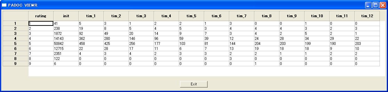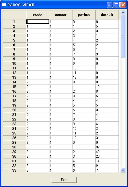 //vectorize inputed data for different names of series variables. //Otherwize you can directly set as 'vector tim[32]' . // vector vec[12]=tim1_12; for(i=0;i<=12;i++) { censor=1; pstime=i; if(i == 0) { default=0; } else { default=vec[i]; } grade=rating; outrec; } select grade censor pstime default;