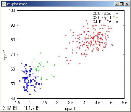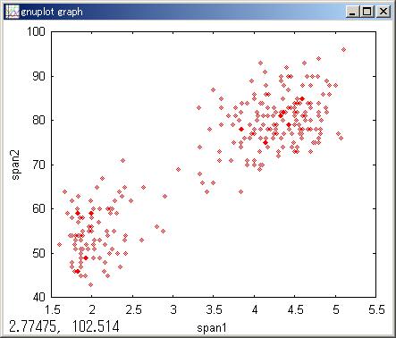 米国のイエローストーンの間欠泉は定期的に50m程の熱水を上げます。 噴水が無い時間(span1)と噴水中の時間(span2)は2峰の混合分布と見なせます。 各点が何れの峰に属するかの確率をEMで解きます。 |
