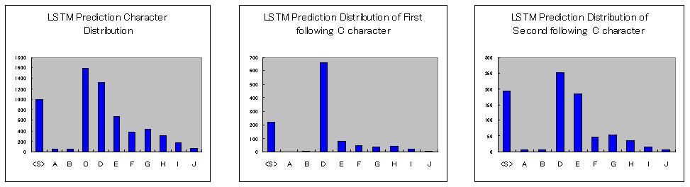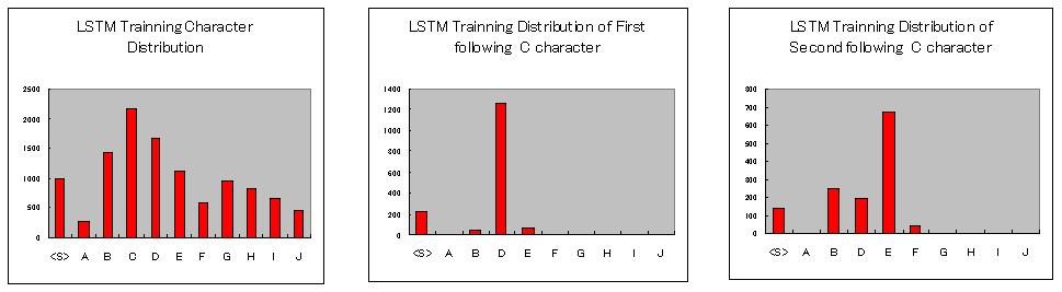 LSTMは前の状態の保持や忘却ゲートを持ち時系列間の適切な関係を学習します あるルールでA〜Jの語で、長さが異なる行を1000行生成させ、これをLSTMに学習させさせます 学習したLSTMがルールを再現できるか、1000行生成し、 学習時と学習後の頻度分布で同じ傾向か確かめます 比較は全文字の分布 Cの文字の次の文字の分布 Cの文字の次次の文字の分布 3層構造 1語に20個のノードを割当て 繰返回数 20回 学習率 0.0002 計算時間 1200sec 活性関数 tanh |