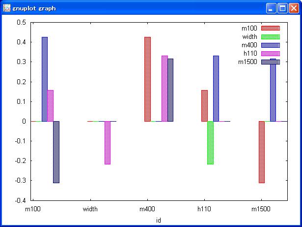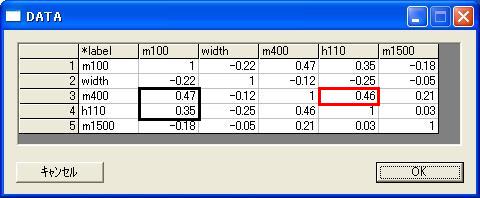 110m障害(h110)は400m走(m400)と相関がかなり高い。赤枠 100m走(m100)は400m走と110m障害の両方に相関が高い。黒枠 これは100m走の記録が伸びると400m走と110m障害の記録も伸びると考えられ 実は110m障害と400m走とは見かけの関係だけで因果関係が無いかもしれない。 |