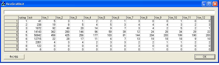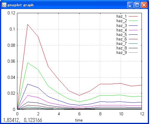1行目に格付(1〜9) 2行目に最初の企業件数 3行目以降に12年間の格付別倒産件数のデータがあります。 このデータから格付別・倒産率の推移を比例ハザードモデルで算出します。 |