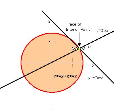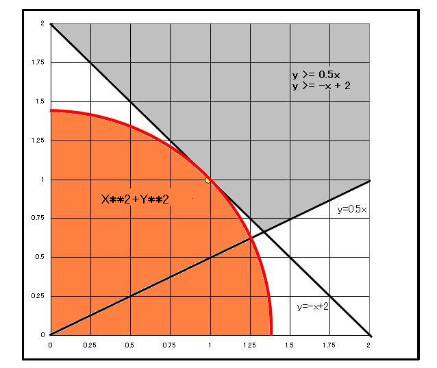 制約式としては不等式を満たす共通の領域とします y >= 0.5x y >= -x + 2 目的関数は領域内で半径が最も小さい円周上の点を求めます。 x**2 + y**2 |