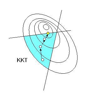 内点法は制約式を満たし目的関数が減少(増大)するKKT条件範囲を内点として