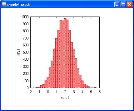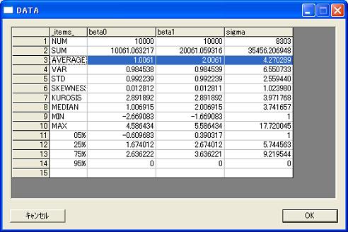 10000回の試行の平均値では回帰係数β0とβ1および標準偏差σが正しく推定されています。 |