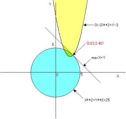 計算結果 X=3.64 Y=3.40 X+Y=7.03の最適解が得られている。