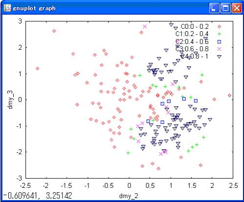 識別はSVMとは異なりRVMは確率で出力されます。 下記は関連度αを50回繰返し計算した結果です。 |