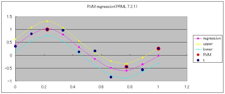 RVMは関連度が高い疎な点で回帰を行います。 関連度は超パラメータの経験ベイズで推定します。 参考文献 PRML(ビッショプ) 7.2.1 |