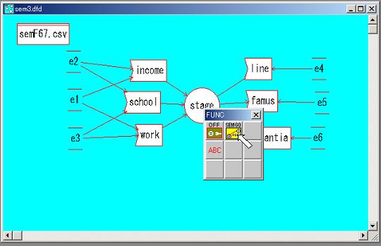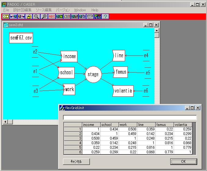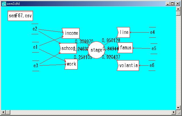 数人の著名人について 収入(income) 学歴(school) 職業(work) 人脈(line) 有名度(famus) 社会貢献度(volantia) について分析した結果、表の相関が得られています。 この項目の関係を説明するため、見えない要因「地位(stage)」を導入します 収入、学歴、職業で「地位」が決まり、 「地位」が人脈、有名度、社会貢献度を決めるモデルとします。 共分散構造モデル図では潜在因子を○で、顕在因子を□で表します 共分散構造分析は結合されている因子間の相関係数を算出します。 |