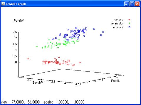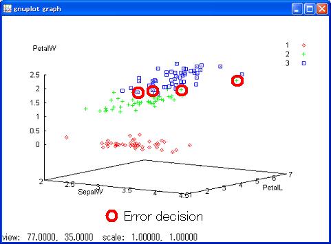 3種類の確率の内、最大のものに区分した結果 境界部分で誤判別が発生しています。 |