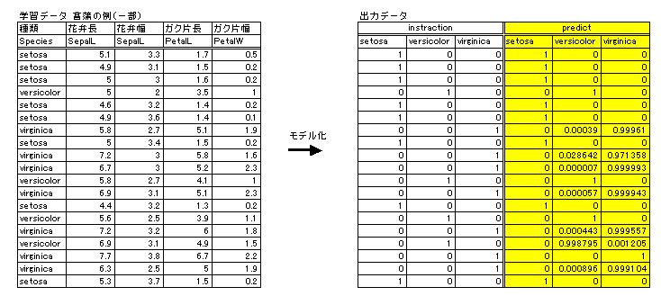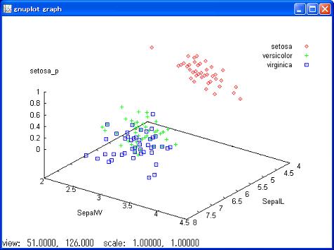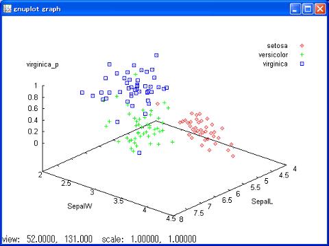 ソフトマックス関数の計算通り、 各種類のの確率はその種類が高く 他種は低い確率で計算されています。 多クラスのロジット回帰が正しく計算されています。 |
