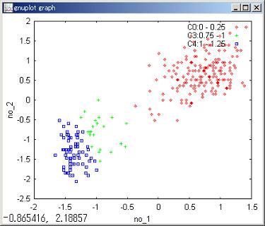 米国イエローストーンの間欠泉Oldfaithfulは定期的に50メートルも熱水を上げます。 噴水の時間間隔no_1と噴水時間no_2のデータは複数の分布が重なった状態になっています。 これを混合ガウス分布と見做して、各点がどの分布に属するが分析します。 |