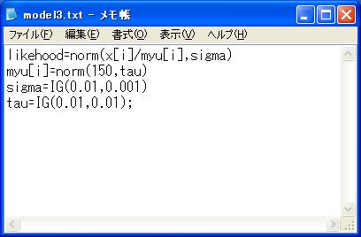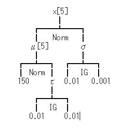 実データを階層ベイズでモデル化してベイズによってパラメータを推定します パラメータの分布は実データの尤度とパラメータの事前分布の積に比例します。 p(μ/σ,τ,x) ∝ p(x/μ,σ,τ)・π(μ) MCMCは推定したパラメータを酔歩メトロポリス・ヘイスティング法で 揺らして実データに従う乱数を生成します |